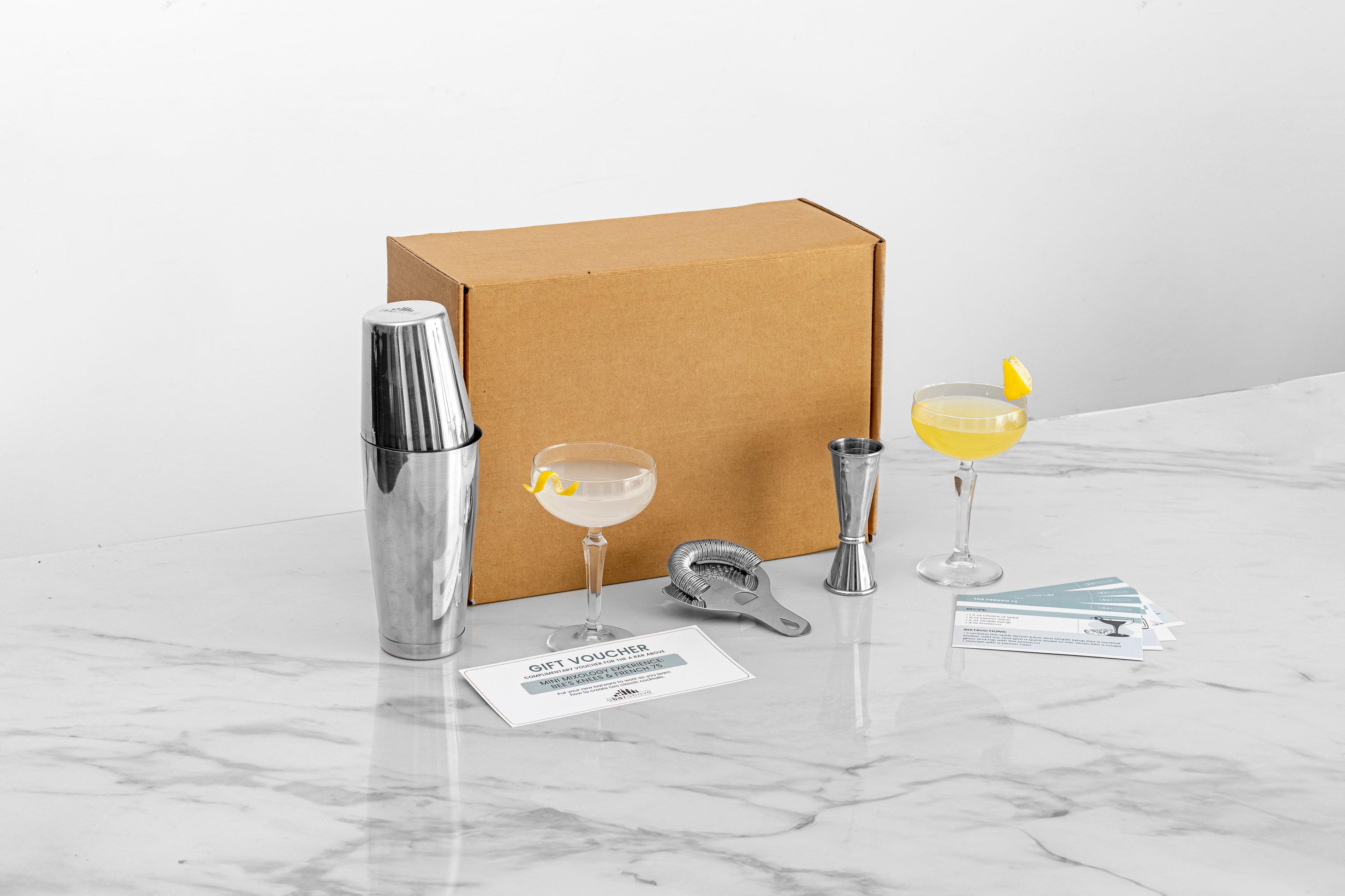 This gift set not only includes a Boston shaker, Hawthorne strainer, and cocktail jigger, but we've also paired our barware with two coupe glasses, a custom-designed shopping list for two cocktails, detailed recipe