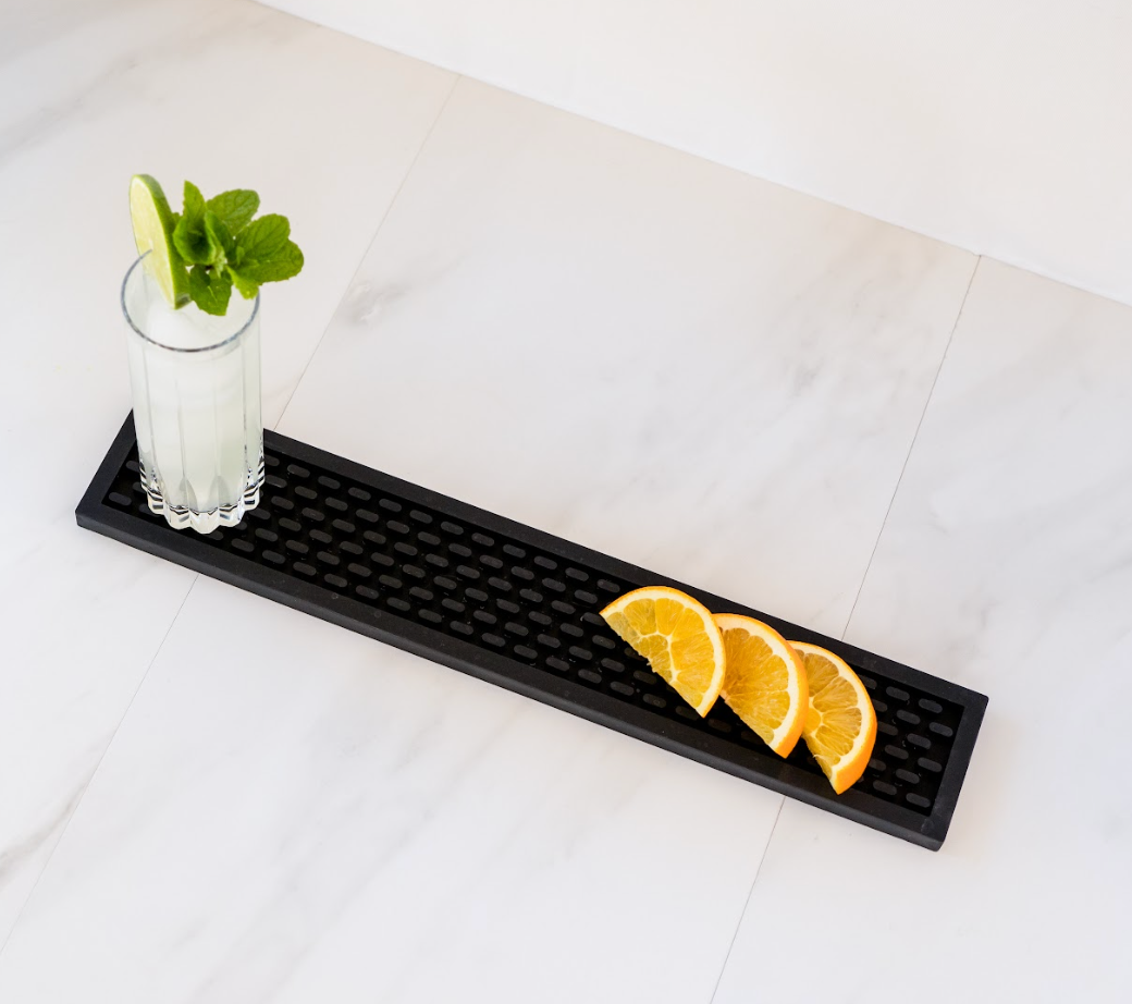 A bar mat is a smaller mat designed to keep your glassware and equipment in place on your bar, countertop, or coffee station. It also catches spills, holds garnishes, and keeps your work area clean and organized.